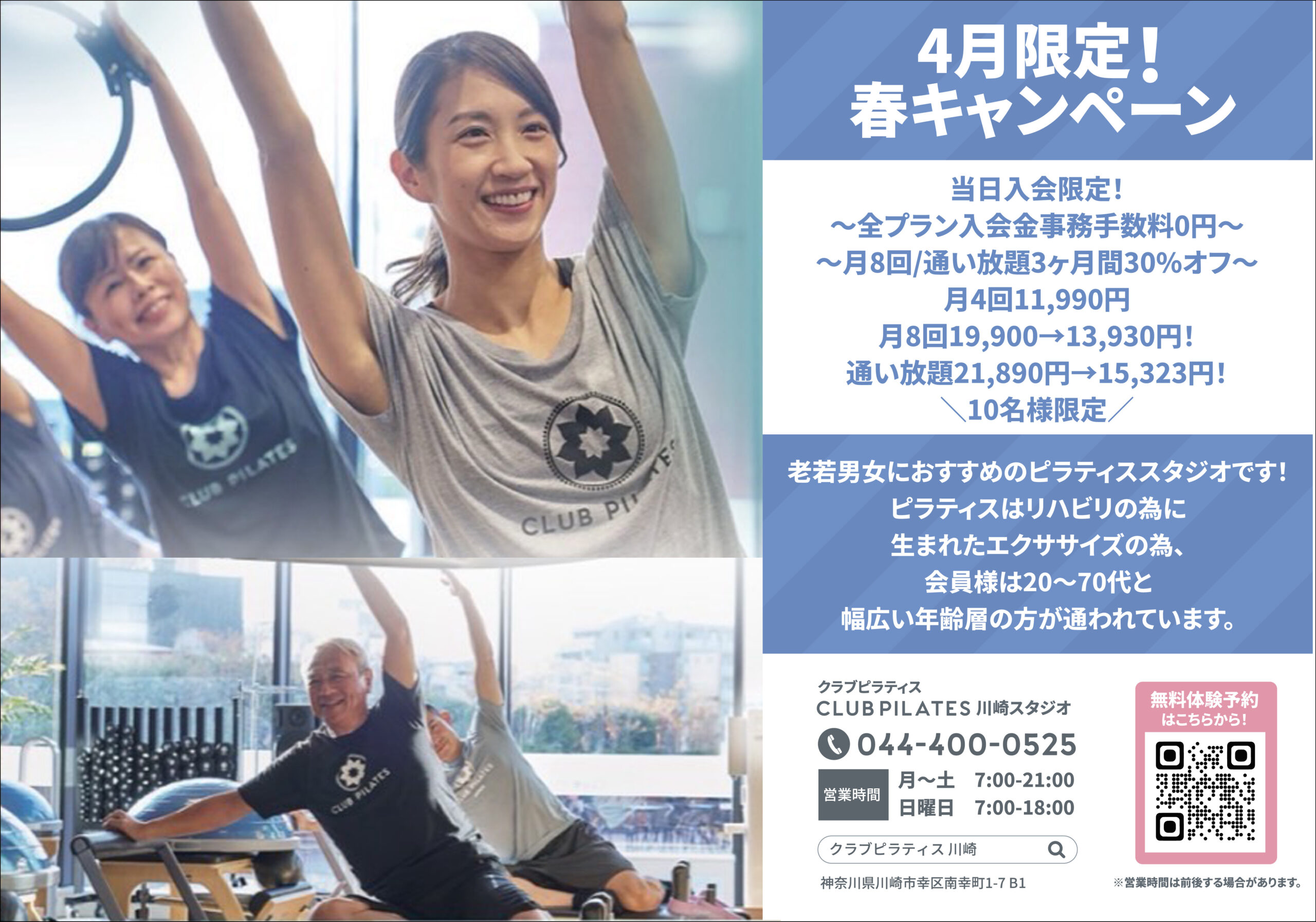 CLUB PILATESのクラスのご紹介などを行いますので、受講時間20分前のご来店をお願いしております。